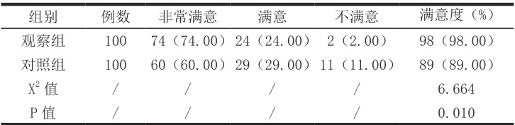 在护理满意度方面,观察组为 98.00% (98/100),对照组为 89.00% (89/100),观察组明显高于对照组,有统计学意义, P<0.05 ;见表2.