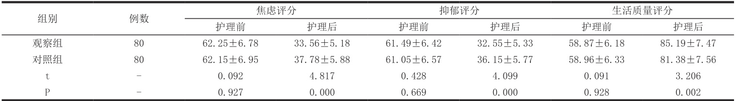 护理前,两组焦虑评分、抑郁评分、生活质量评分差异无统计学意义( P>0.05 );护理后,观察组焦虑评分、抑郁评分明显低于对照组,生活质量评分明显高于对照组,差异存在统计学意义( P<0.05 ),见表1。