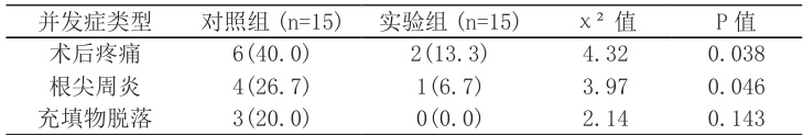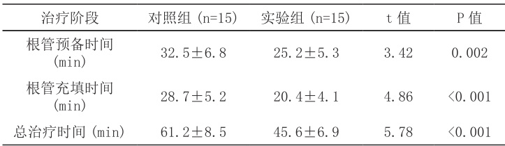 本次研究所选取的病人均为 2023 年 5 月 -2024 年 5 月某医院牙科门诊收治的诊断为慢性牙髓炎的患者 30 例,所有病人均具备根管治疗适应证且自愿参与本研究,根据随机分组法将病人分为 2 组,每组 15 例。纳入标准:年龄18-65 岁,男女不限,临床检查和影像学检查诊断结果均满足慢性牙髓炎诊断指标;具备根管治疗的指征,病人可配合治疗,患者同意参与本研究;排除口腔疾病,即疾病属于轻中度,且有较高的接受治疗比例,所选病人的牙周健康情况较差,严重牙周炎或牙齿松动等患者排除;孕妇及哺乳期患者;有严重全身性疾病患者,即患者伴有心血管病、糖尿病等疾病,影响治疗病情,这类患者排除;无法配合治疗或病人的病情数据记录困难的患者。组间分配:两组病人具备良好的可比性,利于研究结果具有科学性和公平性 [1]。