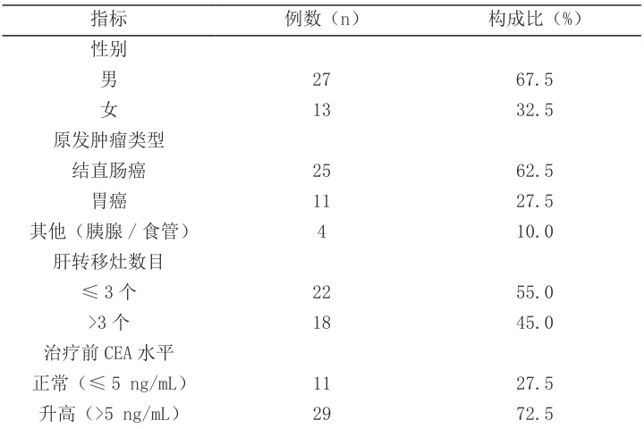 40 例患者中,男性27 例( 67.5% ),女性13 例( 32.5% );年龄 42\~72岁(中位 58 岁);原发肿瘤以结直肠癌最多(25 例, 62.5% ),其次为胃癌(11 例, 27.5% );肝转移灶数目 ⩽3 个者 22 例( 55% ), >3 个者 18 例( 45% );治疗前CEA 升高( >5ng/mL )29 例( 72.5% )。具体见表1。
