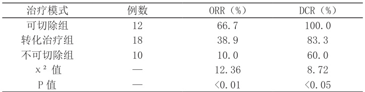 MDT 模式下,ORR 为 42.5% (17/40),其中完全缓解(CR)2 例( 5% ),部分缓解(PR)15 例( 37.5% );DCR 为 82.5% (33/40),疾病稳定(SD)16 例( 40% ),疾病进展(PD)7 例( 17.5% )。不同治疗模式的疗效差异见表 2 。