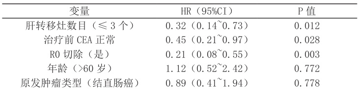 截至 2025 年 5 月,中位随访时间 16 个月(3\~24 个月),中位 OS 为18.6 个 月(95%CI 15.2\~22.0), 中 位 PFS 为 9.2 个 月( 95%CI 7.1~11.3), 。Cox 多因素分析显示,肝转移灶数目( ⩽3 个)、治疗前 CEA 正常、R0 切除为独立预后保护因素(表3)。
