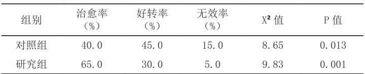 如表所示,研究组治愈率显著高于对照组( P<0.05 ),无效率显著低于对照组( P<0.05 )。