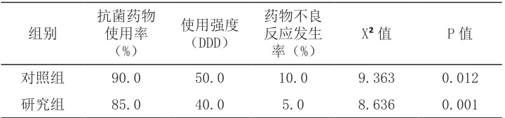 如表所示,研究组抗菌药物使用率、使用强度及药物不良反应发生率均低于对照组,但仅药物不良反应发生率差异有统计学意义( P<0.05), 。