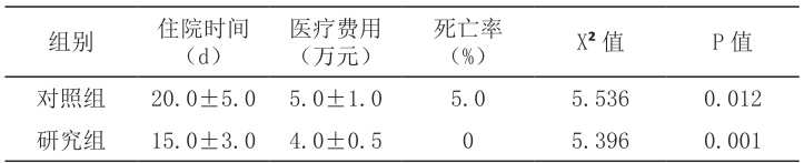 如表所示,研究组住院时间、医疗费用均低于对照组,且死亡率为零,与对照组相比差异均有统计学意义( P<0.05 )。