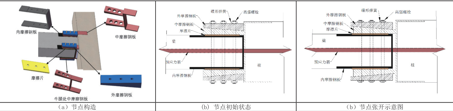 基于此,本研究提出一种自复位木结构节点形式,贯穿于梁柱中的预应力筋和节点的耗能器构造可有有效提高结构的整体刚度、承载力及跨越能力。此外,节点利用预应力筋实现复位消除残余变形,利用摩擦耗能器耗散能量从而避免梁柱等主体构件的破坏,进而实现构件的重复利用。