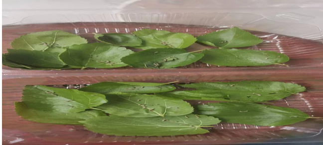 蚕宝宝主食是桑叶,但是也可以吃一些榆树叶子,可以吃一些生菜。我们找到了一棵很小的桑树,那桑树也是刚刚发芽,只长出几片小小的薄薄的叶子。每次去摘几片,放在盒子里给蚕宝宝吃,可是过一段时间叶子就干了。尤其经过一个晚上,早上来看的时候盒子里的叶子总是干干的。