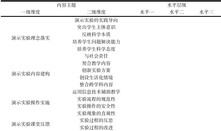 经过对已有相关文献的理论探讨,研究确定了包含“演示实验理念落实”“演示实验内容构建”“演示实验操作实施”“演示实验分析与评估”四个一级维度、十五个二级维度演示实验教学行为的分析框架,并给出不同指标不同水平的分级标准,在此基础上生成演示实验教学行为 × 水平层级的一致性分析框架,如表1 所示。