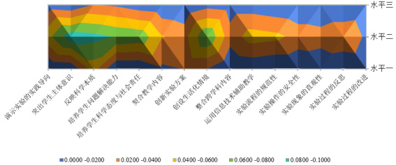此外,演示实验教学行为水平层次分布有所异同。教师演示实验教学行为呈现出基础达标、高阶不足的特点。相同之处在于,教师演示实验教学行为的表现水平与课程标准要求的水平层次均集中在水平一、水平二。这表明教师能够确保演示实验教学达到课程标准规定的基本要求。不同之处在于,在教学行为的某些维度上,教师表现未达到课程标准的要求。主要表现在整合跨学科内容与反映科学本质维度上,教师在整合跨学科内容方面达到第二水平以及在反映科学本质方面达到第三水平占比区间均在 0.0000-0.0200,而课程标准的相应占比区间在 0.02000-0.0400 这一差异体现了教师对演示实验的跨学科内容整合不够且对科学本质的认识不足。在培养学生问题解决能力、培养学生科学态度与社会责任、创设生活化情境的第二水平的达成度也较低。这表明,教师亟需提升演示实验教学的水平层次。