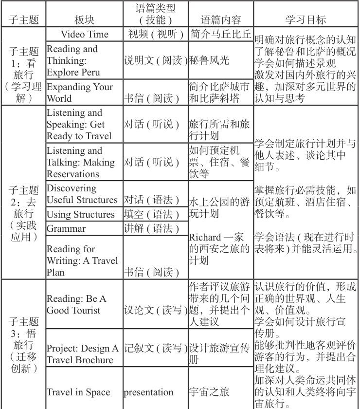 以项目任务的完成为目标,引入本单元要学习的内容。本单元主题语境属于 “人与自然”。内容是以旅游为主题,制定旅游计划,预定旅游相关服务;介绍旅游景点;锻炼语言技能(现在进行时表将来)和强化语音知识。基于语篇分析,引导学生以单元主题意义为核心,把单元内容重新建构,提炼出“看旅行- 去旅行- 悟旅行”三个子主题以及对应的学习目标(如下表)。