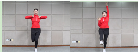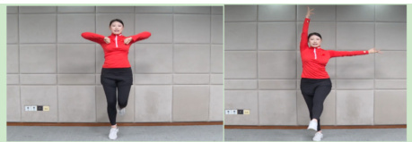 在步伐动作方面:右脚、左脚依次打开,顶髋4 次。在手臂动作方面: