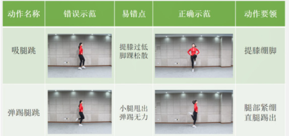 针对上述存在的问题,教师同样是通过多媒体教学法,通过视频的方式,展示错误动作的纠正方法,让学生掌握动作要领。针对吸腿跳存在的问题,教师提示学生作健美操时做到“提膝绷脚”;针对弹踢腿跳的问题,建议学生“腿部绷紧,直腿踢出”。如下图6,为学生存在的问题,以及具体纠正。
