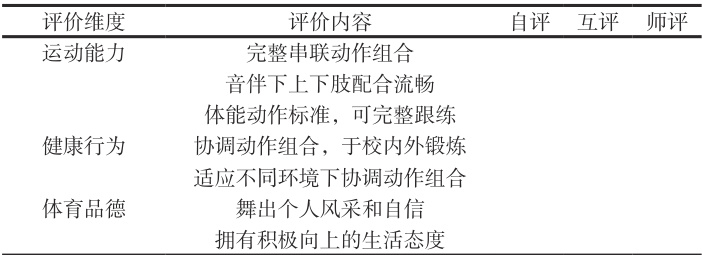 在课后,教师通过制作电子表格的方式,让学生进行自评、互评,以及教师评价,使每位学生明确个人在素养达成中存在的问题,并进行针对性纠正。与此同时,教师针对学生存在的集中性问题,进行教学反思,实现以评促教、以评促教学,发挥信息技术在女生健美操教学中的最大效益。在实际的评价上,教师设计如下表1 内容: