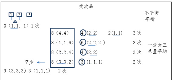 探索:你还想利用天平在几个物品中找次品(次品较重或较轻一点),至少称几次保证能找到次品?怎么称?