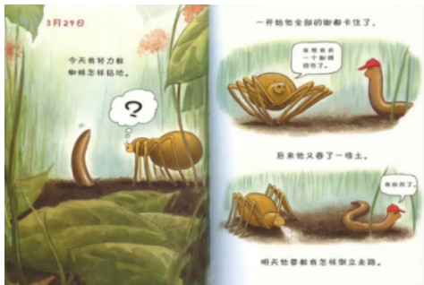 基于此,我先引导学生观察图像细节:“蚯蚓的身体是什么姿势?蜘蛛的爪子在做什么?它的表情能告诉我们什么?”通过问题引导,学生发现“蚯蚓身体弯成了‘U’形,像在用力”“蜘蛛的爪子紧紧抓着泥土,神情茫然又不知所措”。紧接着,我总结道:“这些图像细节,向我们展示了蚯蚓为什么放弃教蜘蛛钻土”。而学生由此联想到自己在写日记时,也可以按照“用细节说感受”的方法写作。由此,通过绘本图文关系的引导,学生学会了“从图像找细节,从细节表感受”,有效解决了日记“无内容可写”的问题。