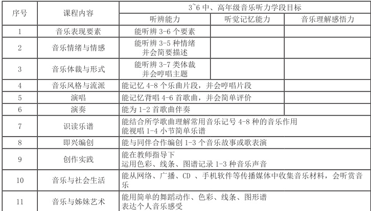 表三:《5~6 中、高年级音乐听力培养的学段目标■》