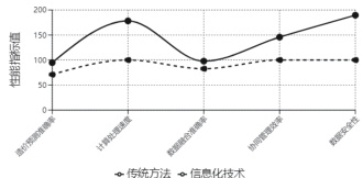 注:传统方法采用虚线表示,信息化技术采用实线表示;造价预测准确率和数据融合准确率以百分比显示,其他指标以传统方法为基准值 100显示相对提升。