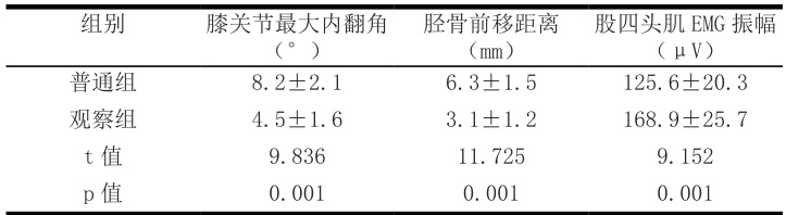 干预后,观察组膝关节最大内翻角、胫骨前移距离显著小于普通组,股四头肌EMG 峰值振幅显著高于普通组( P<0.05 )。详见表1。