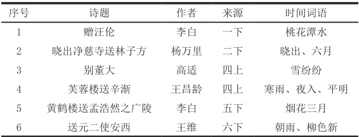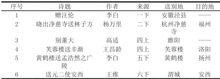 这六首送别诗中,有两首我们可以直接从诗题中知道被送者的目的地。李白的《黄鹤楼送孟浩然之广陵》目的地是广陵,也就是今天的扬州。《送元二使安西》的目的地是安西,也就是今天的新疆、甘肃一带。王昌龄的《芙蓉楼送辛渐》我们也可以从诗文中得到辛渐的目的地是洛阳。李白的《赠汪伦》、杨万里的《晓出净慈寺送林子方》和高适的《别董大》这三首诗我们虽然不能从诗题和诗文中得到被送者的目的地,但是通过背景知识的学习我们也能够了解到被送者的目的地。如表1.2 所示: