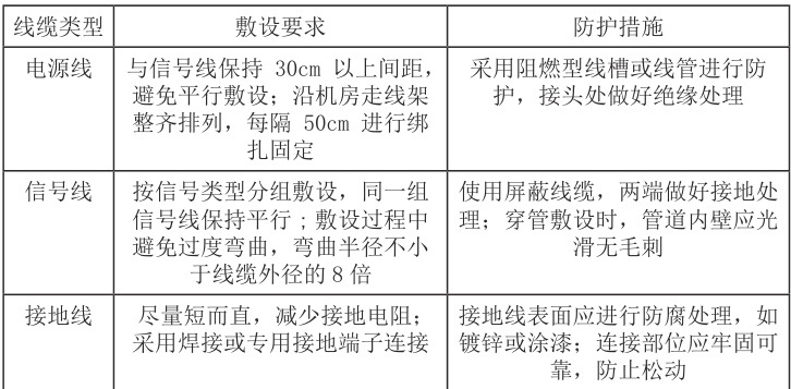 使用精度为 ±2% 的接地电阻测试仪定期对接地电阻进行测试,新装机房在设备安装完成后必须立即进行测试,以保证接地系统符合要求。后续每年至少检测一次,及时发现并解决接地电阻异常问题。根据机房的实际布局和电磁交换机等设备的用电需求、信号传输需求,设计科学合理的布线方案。线缆应按照不同类型,如电源线、信号线等进行分类敷设,分类敷设能有效减少不同线缆之间的相互干扰。同时,采用线槽、线管等进行保护,线槽可选择防火、防潮、防鼠咬的材质,线管应具备良好的绝缘性能和机械强度。具体不同类型线缆的敷设要点如下表所示: