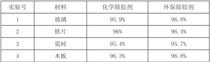 3. 除胶效果:除胶效率测试:采用重量法测定除胶效率。将环氧树脂胶和丙烯酸酯胶分别均匀涂覆在尺寸为 50mm×50mm×1mm 的玻璃片上,按照胶粘剂使用说明进行固化。使用精度为 0.0001g 的电子天平称取涂胶玻璃片初始质量m0∘ 。在涂胶玻璃片表面滴加 0.5mL 除胶剂,迅速用保鲜膜覆盖,防止溶剂挥发,在室温( 25±2∘C )下反应。每隔一定时间,用镊子轻轻揭起保鲜膜,观察胶层溶解情况。当胶层完全溶解或不再有明显溶解迹象时,用去离子水冲洗玻璃片,去除残留除胶剂,再用无水乙醇擦拭,置于干燥箱中,在 50∘C 下干燥至恒重,称取此时玻璃片质量 m1 。除胶效率计算公式为: