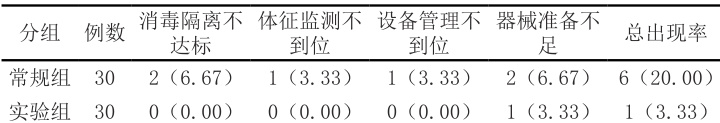 对消毒隔离不达标、体征监测不到位、设备管理不到位以及器械准备不足等风险事件出现情况进行统计,对比每组病患风险事件出现率。