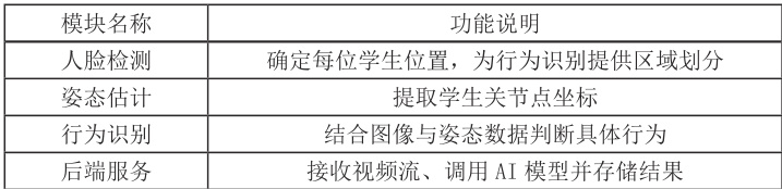 可视化展示层:基于Web 平台展示识别结果,包括学生行为统计图、异常行为预警等。
