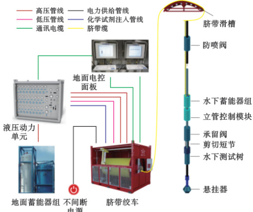 按照 ISO 13628-7、ISO 13628-4、ISO 10423、API 16D 等标准设计的系统,应当具备下述主要功能:(1)快速解脱以及连接,按照规定重新连接时间不应超过 45s,一般该系统的连接时间能够控制在 15s 以内;(2)失效保护,电信号失灵时通过地面的高压流体实现水下结构的直接控制;(3)注入化学试剂抑制水合物生成;(4)数据实时传输处理;(5)集成隔水管以及防喷器系统。