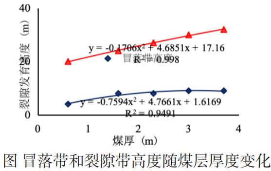 由图可以看出,冒落带和裂隙带高度随着煤层厚度的增加逐渐增加,冒落带和裂隙带高度与煤层厚度之间关系呈二次曲线关系