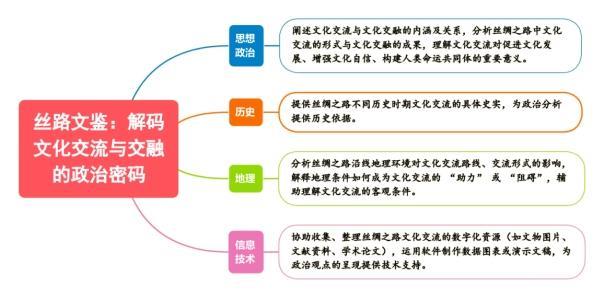 交融组:挖掘丝绸之路中文化交融的典型成果。历史组提供丝绸之路上文化交融实例,地理组分析不同地理特质如何促进交融,信息组绘制文化交融成果的时间轴和相关表格。