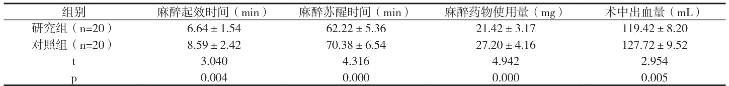 研究组麻醉起效、苏醒时间、药物用量和术中出血量等参数较对照组更低( P<0.05 ),见表。