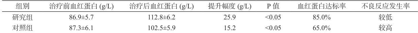 研究结果显示,经过治疗后,研究组患者的血红蛋白水平显著提高,从治疗前的 g/L 提升至( 112.8±6.2 ) g/L ,提升幅度为 25.9g/L ,且提升幅度显著( P<0.05 ),相比之下,对照组的血红蛋白水平从( 87.3±6.1 ) g/L 升至( 102.5±5.9 ) g/L ,提升幅度为 15.2g/L ,提升幅度虽也具统计学意义( P<0.05 ),但明显低于研究组( P<0.05 ),研究组中血红蛋白达标率为 85.0% ,高于对照组的 65.0% ;不良反应发生率也较低,以上结果表明,基于循证护理理论的多模式护理对急诊哮喘急性发作患者的呼吸功能恢复具有显著促进作用,尤其在血红蛋白水平提升方面表现突出,疗效优于常规护理干预。