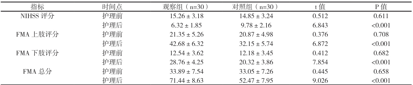 护理前两组NIHSS、FMA评分比较差异无统计学意义(P>0.05);护理后两组评分均改善,且观察组 NIHSS 评分显著低于对照组,FMA 总分及上下肢评分显著高于对照组( P<0.05 )。详见表1。