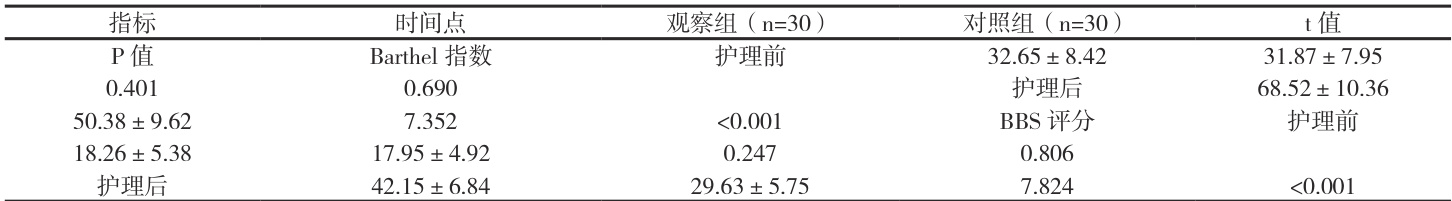 护理前两组 Barthel 指数及 BBS 评分比较差异无统计学意义(P>0.05);护理后观察组两项评分均显著高于对照组(P<0.05)。详见表 2。