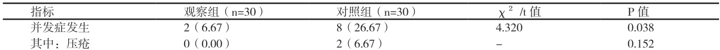 观察组并发症发生率显著低于对照组( P<0.05 ),护理满意度#P <0.05 。BBS 评分 ⩾40 分为平衡功能正常。 显著高于对照组( P<0.05 )。详见表3。