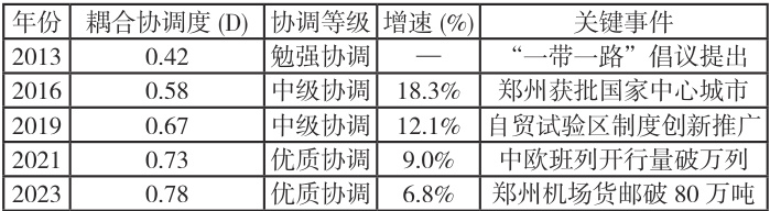 战略与基建协同效应方面,耦合协调度从2013 年0.42(勉强协调)提升至2023 年0.78(优质协调),年均增长 12.7% ,其中 2016 年郑州获批国家中心城市后协调度增速达峰值 18.3% ;分区域看,郑州(0.92)、洛阳(0.81)为高协同区,豫南地区(如信阳0.65)仍存在战略衔接滞后。