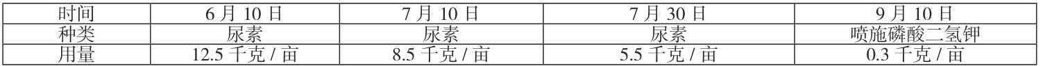 2.2.2 追肥技术 因地温升高破除地膜后,每月中耕锄草2 遍,以保持土壤疏松、干净无杂草。当苗木进入速生期,6—7 月追施氮肥3 次,开沟施肥后及时灌水,生长后期,在 9 月上旬,适量追施磷、钾肥,以促进苗木充分木质化,增强抗寒能力,以利于安全越冬。具体施肥种类及用量请见表1。