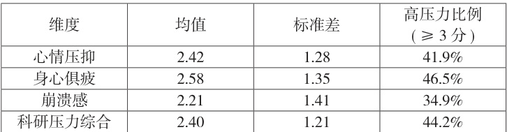 问卷设计涵盖研究生基础信息(性别、学生类别、专业排名等)、心理健康状况(PHQ-9 和 GAD-7 量表改编)、科研压力感知、导学关系质量(正向互动 + 负向冲突双维度)、心理韧性(CD-RISC 量表精简版),调查共收回有效问卷215 份。