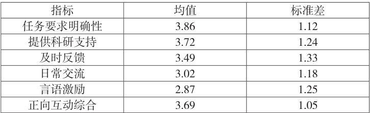 正向互动关系中,导师在任务分配明确性上(均值3.86)表现最佳,但及时反馈(均值 3.49)是短板。日常交流匮乏(均值 3.02)与情感激励缺失(“导师言语激励”均值 2.87)构成情感支持的短板。其中仅 16.3% 学生获得高频日常交流( ⩾4 分),与科研压力呈强负相关。