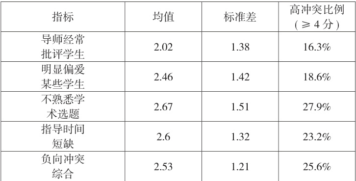 负向冲突关系中,导师在不熟悉学生学术选题(均值 2.67)的高冲突得分比例最高,占 27.9% ,指导时间短缺(均值 2.6)占 23.2% ,构成冲突的显性诱因。