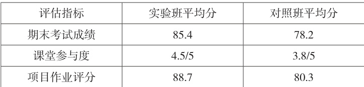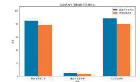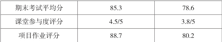 从表中可以看出,混合式教学班级的期末考试平均分为 85.3 分,显著高于传统教学班级的 78.6 分,表明学生在知识掌握方面有明显提升。课堂参与度评 分方面,混合式教学班级达到4.5 分(满分 5 分),显示出学生在课堂活动中的 积极性和参与度更高。项目作业评分也显示出混合式教学班级在技能应用上的优 势,评分为 88.7 分,相较于传统教学班级的80.2 分有显著提高。