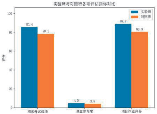 从表 1 可以看出,实验班在各项评估指标上均优于对照班,尤其在课堂参与 度和项目作业评分上表现突出。这表明混合式教学模式有效提升了学生的学习兴 趣和实践能力,与文献中关于混合学习对学生学习兴趣的积极影响相一致[1]。 通过这些数据分析,能够及时发现教学中的不足之处,并为后续的教学改进提供 科学依据。