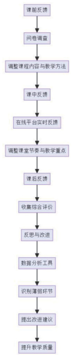 在课前,教师可通过问卷调查了解学生的学习需求和预期目标,从而调整课 程内容和教学方法。在课中,利用在线平台进行实时反馈,教师可以根据学生的 即时反馈调整课堂节奏和教学重点,增强教学的针对性和有效性。课后,收集学 生对课程内容、教学方法和学习效果的综合评价,教师可据此进行反思和改进。