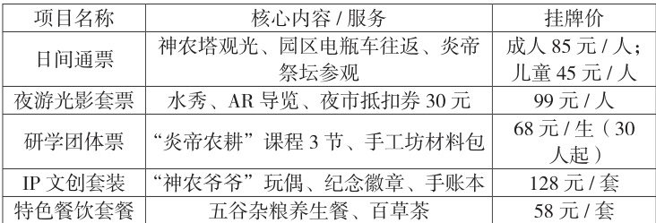 表2-1 神农城景区主要产品与挂牌价(2025 年)