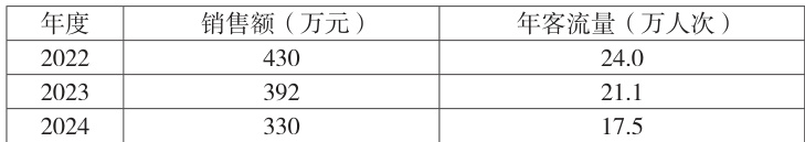 2022-2024 年销售额从 430 万元降至 330 万元、三年跌幅 23% ,但同期客流量自 24 万人次锐减至 17.5 万人次,累计降幅达 27% 。客流降幅大于收入降幅,意味着景区通过提高人均消费(维持在 110–120 元区间)来对冲基数减少。然而“量减价挺”策略已逼近极限:2024 年客流基数创三年来新低,若客单价继续上调势必削弱价格敏感型家庭与研学团队的购买意愿,形成恶性循环。