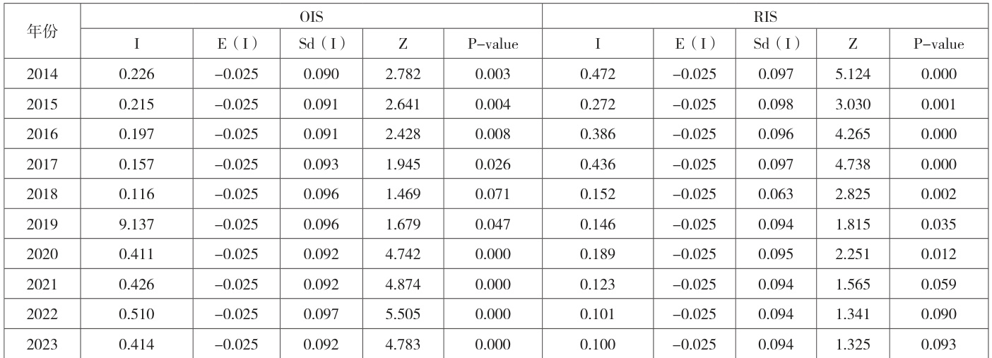 为了了解长三角地区城市间产业跃迁升级是否存在空间自相关性,本文选用 Moran’s I 指数进行验证。结果如表 3-1 所示,在地理邻接矩阵下,产业结构升级的 Moran’s I 指数多数年份小于 0.05,通过了 95% 水平下的置信检验,表明产业结构升级存在显著的空间正相关关系,验证了空间效应的存在。进一步分析,产业结构高度化的莫兰指数较为稳定,指数逐年增加,这意味着产业跃迁升级在空间上的集聚趋势更加明显,即更倾向于集中在同一区域或邻近地区。考虑到产业结构高度化需要邻近城市间的产业链分工深化从而提升产业集群韧性,同时邻近城市间政策协同与市场一体化有助于降低制度性壁垒,增强产业升级动力,因此与邻近城市关联性较强。而产业结构合理化更多依赖本地资源禀赋优化,内生驱动机制占据主导地位,与邻近城市关联不强。
