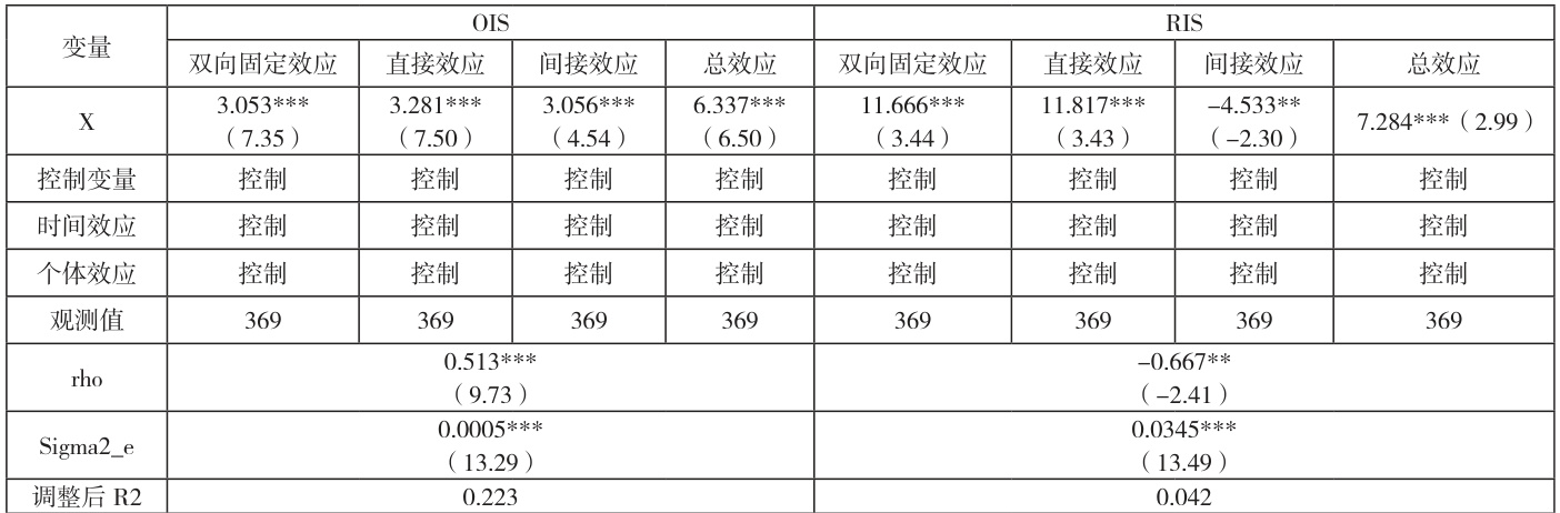 (2)从产业合理化角度看,本地区新质生产力水平的提高对优化本地产业结构合理化具有积极效果;空间滞后系数(rho)为负且通过了显著性检验,各城市的经济发展具有明显的空间相关性,且表现为显著的负向空间溢出作用,这与莫兰指数的分析一致。其原因在于分税制改革及其直接所诱发的 GDP 偏好与谋求土地财政,成为“大城市偏向”的重要制度根源。在中心城市不断扩张的同时却带来了小城市发展的严重滞后,表现为经济增长为负向空间溢出,出现了“马太效应”,即空间竞争效应大于空间溢出效应。