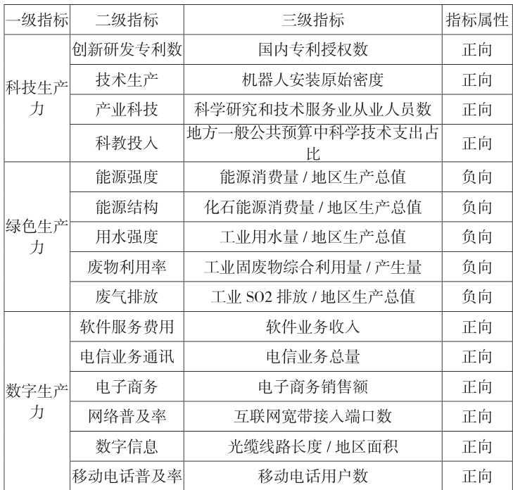 关于新质生产力的指标测度方面,不少学者构建了多维度的评价指标体系,为测量新质生产力水平提供了定量分析标准。如卢江等构建了科技生产力、绿色生产力和数字生产力的综合评价体系,并对我国新质生产力水平区域差异进行了比较分析[7]。还有部分学者从马克思生产力三要素理论出发,构建了基于新质劳动者、 新质劳动对象、新质劳动资料 3 个维度的新质生产力指标测度体系,探究并验证了新质生产力对不同时间维度、 空间维度的动态演变特征最终将生产关系进行量化 [8-9]。