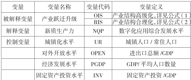 式中, 0ISit 和 RISit 分别为i城市第t年的产业结构高级化和合理化,NQPit 为i 城市第 σt 年的新质生产力水平, μit 为个体固定效应, Φit 为时间固定效应, εit 为随机扰动项,其余为控制变量。