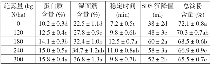 为精确量化氮肥用量对小麦品质的影响,我们在严格控制其他变量(品种:强筋小麦“济麦 22”;土壤类型:壤土,基础肥力中等;水分管理:充足灌溉)条件下,设置了 5 个梯度的纯氮施用量田间试验(0、120、180、240、 300kgN/ha ),并在成熟期进行籽粒品质测定。
